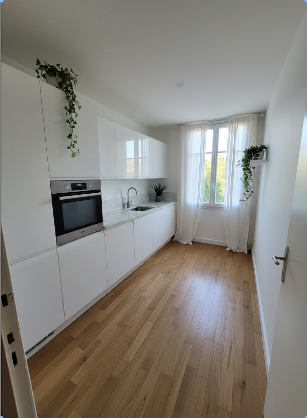 Pour aider à la projection, nous avons réalisé des propositions d'aménagement en images, notamment pour la future cuisine et le salon entièrement repensés. Ces visuels mettent en lumière le potentiel remarquable du bien une fois rénové, avec des volumes optimisés et une ambiance moderne et chaleureuse.